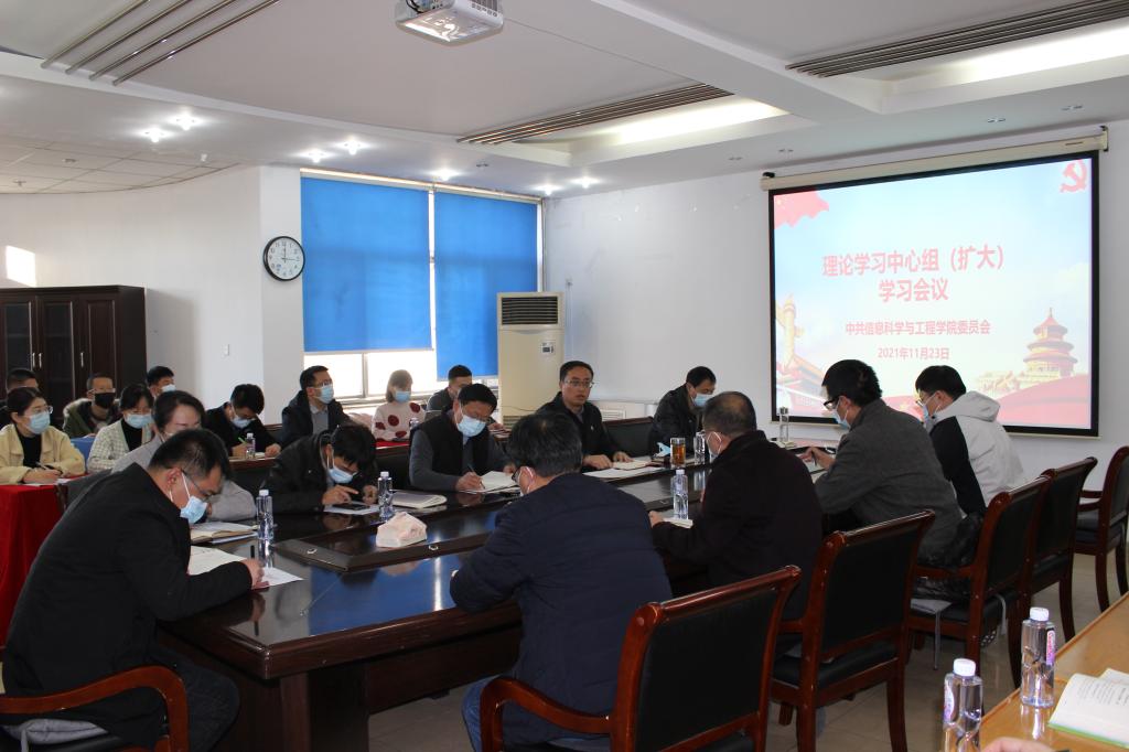 11月23日下午,信息科学与工程学院(软件学院)党委理论学习中心组(扩大)学习会在信息馆302室召开,专题学习党的十九届六中全会精神。学院领导班子、党委委员、组织员、教工党支部书记和学生党支部书记参加了会议。会议由学院党委书记王昕主持。