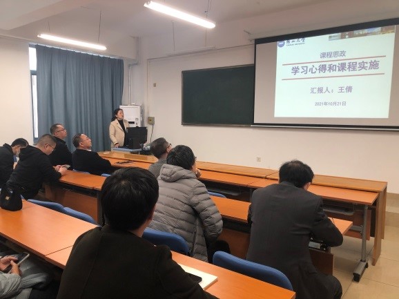 随后,王倩老师结合其承担的《软件工程》课程分享课程思政教学经验,围绕课程思政的起源、课程思政的内涵、课程思政讲什么、典型思政案例、课程思政在软件工程中的实施与总结和反思6方面介绍了如何将专业教学与思想政治教育相结合,并指出找到专业知识与思政内容的契合点是最为核心、最为关键和最难解决的问题。课程思政追求的高境界是实现理直气壮讲思政,润物无声讲思政。根据王倩的介绍,大家从“立德树人”根本任务出发,围绕专业课程的思政理念、思政教育的形式、思政教育教学方法以及教学环节设计等方面进行了深入交流与讨论。老师们一致认为,在今后的教学活动中,开展全系范围内的课程思政案例库建设,认真总结教学方法和考核方式等相关经验,可以更好地让课程与思政相结合。