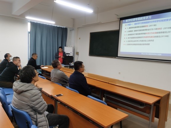 首先,系副主任陈真带领大家一起学习了《高等学校教师职业道德规范》、《新时代高校教师职业行为十项准则》和《燕山大学本科生课程考试管理规定》等国家相关制度文件和学校文件。针对教学纪律的相关文件和制度,全体教师结合自身工作实际展开了交流讨论,大家对照国家文件和学校制度要求,检视自身教学环节,围绕课堂教学责任、课堂教学纪律、监考职责履行等方面进行了讨论和交流。通过本次学习活动,全体教师深刻理解了教学纪律相关国家文件和学校制度要求,进一步明确了教师在开展备课、上课、考试和总结等教学活动中的职责和注意事项,对于维护正常的教育教学秩序,强化教师教学主体责任,推动师德师风建设起到了积极作用。