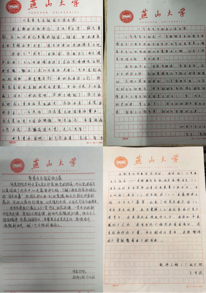 魏继扩写到:我用青春告白祖国。青年是国家的希望,对新时代中国青年来说,热爱祖国是立身之本、成才之基。用奋斗的青春告白祖国,就是要把小我融入大我,让青春之花绽放在祖国最需要的地方,更意识到我们青年的富足生活不是轻松得来的,意识到我们青年所承担着的重要职责。我们现在不应只单单成为祖国的花朵,更应成为祖国的栋梁,祖国的未来,为祖国,为成为”大国工匠“而拼搏奋斗。 通过这次学习优秀事例,我愈来愈有了作为大学生的责任感与使命感。千言万语说不尽我对祖国的浓浓情感,只愿用我的青春来告白祖国,用我的青春来感恩祖国!