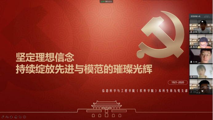 为深入学习贯彻燕山大学庆祝中国共产党成立99周年暨表彰大会精神,以庆祝中国共产党成立99周年为契机切实抓好学生党员党性教育,保持共产党员的先进性,强化学生党员的身份意识与责任意识,信息科学与工程学院(软件学院)本科生第九党支部于7月1日晚通过腾讯会议系统召开主题党日活动,全体学生党员及部分入党积极分子参加活动。