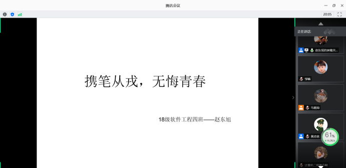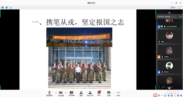 为深入贯彻落实全国大学生征兵工作会议精神,推进学校大学生应征入伍工作,鼓励和引导在校大学生携笔从戎,投身军营,帮助在校大学生了解今年的征兵政策,激发大学生参军入伍的积极性,6月24日,信息科学与工程学院(软件学院)通过腾讯会议平台召开线上入伍经验交流会暨政策宣讲会,学院2020届级部分毕业生及有意愿参军入伍的其他年级学生总计一百余人参加了会议。