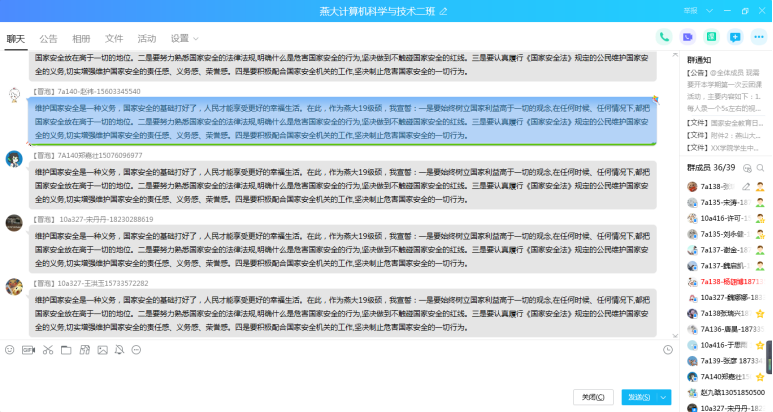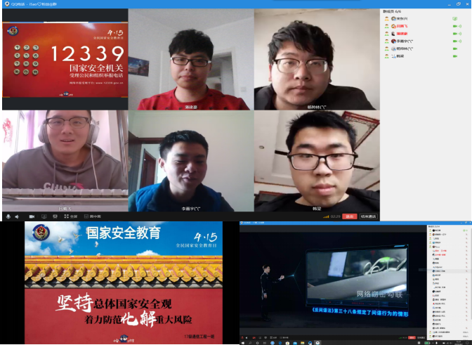 利用腾讯会议软件召开音视频主题班会,以加强法治宣传教育、增强全民国家安全意识的宣传主题,普及《国家安全法》、《反恐怖主义法》、《反间谍法》、《保守国家秘密法》等重点法律,突出习近平总书记关于国家安全工作和总体国家安全观的一系列重要论述、重要指示,通过完成全民国家安全教育日视频资料,宣传挂图等资料的线上学习,着力强化广大青年的国家安全意识。开展主题团日活动,组织国家安全法进班级活动,积极为学生传授国家安全法及典型案列、安全防范知识,着力增强学生的爱国意识和国家安全意识。
