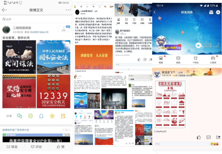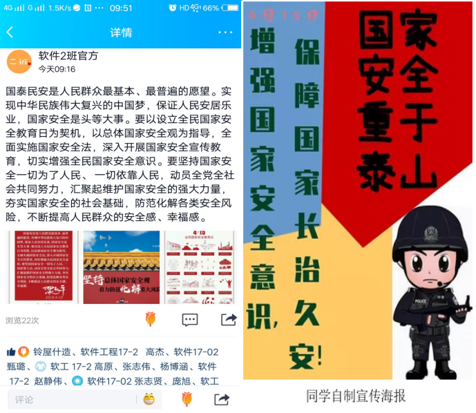 在观看国家安全教育日宣传资料的同时,纷纷在QQ空间或朋友圈等公众平台发表个人感悟,在学习国家安全教育的同时,也让同学们正确认识了国家安全形势,同时增强了“安而不忘危”的忧患意识,作为即将踏入社会的青年一代,脑中必须树立正知正见,才能更好的报效祖国,为社会为人民出力。