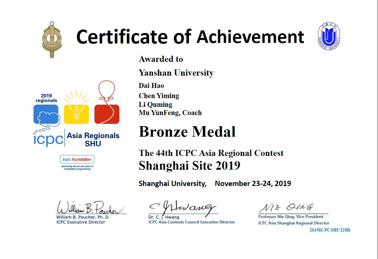 11月23日至24日,第44届ICPC国际大学生程序设计竞赛亚洲区域赛在上海大学举行,由我校信息科学与工程学院(软件学院)软件工程专业学生戴昊、李曲铭和计算机专业学生陈一铭组成的参赛队,在程序设计与算法竞赛集训队总教练穆运峰老师的指导下,经过激烈角逐获得铜牌。