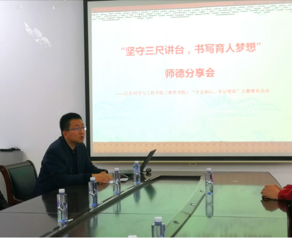 2019年10月24日14点,信息科学与工程学院(软件学院)工会在信息馆302室开展师德师风教育月专题活动——师德分享会。活动以“坚守三尺讲台,书写育人梦想”为主题由院工会主席李浩然老师主持,邀请车辆学院唐先智老师,理学院朱键卓老师与我院教师进行师德师风建设交流分享。