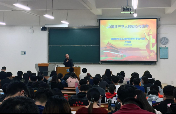 为深入推进“不忘初心、牢记使命”主题教育,切实提升学生党员、发展对象的政治素养和理论水平,按照学院主题教育安排,2019年10月24日下午15:30,信息科学与工程学院(软件学院)党委书记卢辉斌在里仁教学楼J205为信息科学与工程学院(软件学院)、环境与化学工程学院联合分党校第61期党员与发展对象培训班学员作主题为“中国共产党人的初心与使命”的专题党课。
