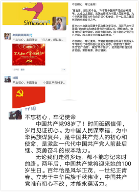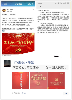 党支部全体党员自觉发起了以“不忘初心、牢记使命”为主题的宣传活动。党员们在微信、微博等线上平台上用最质朴、最真诚的话语表达了自己对党的祝福。