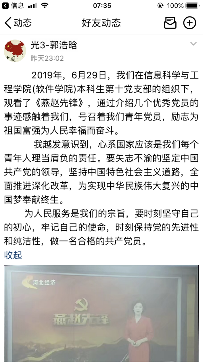 2019年6月29日下午,信息科学与工程学院(软件学院)本科生第十党支部全体50名党员在西校区第一教学楼108室组织观看了“七一”特别节目《燕赵先锋》。
