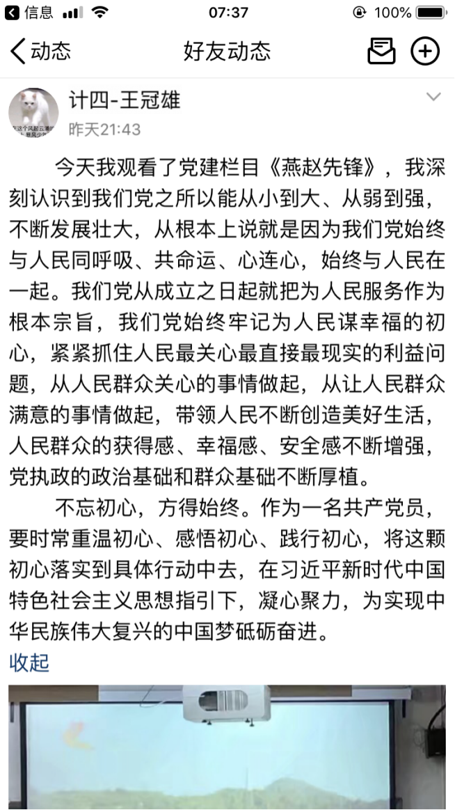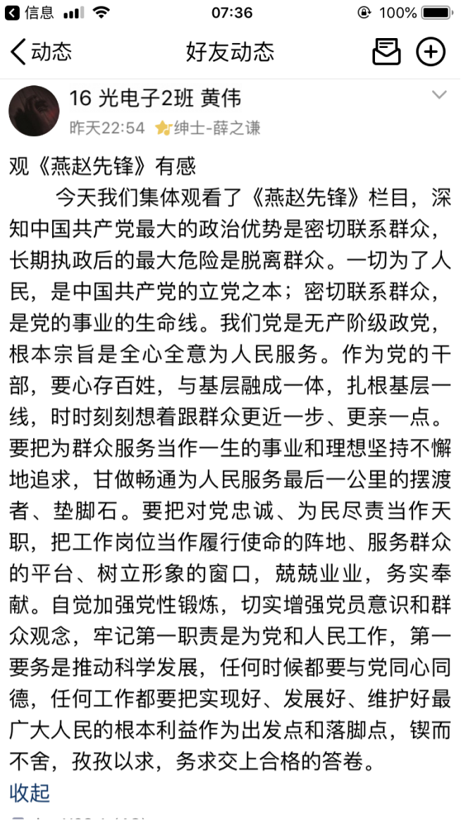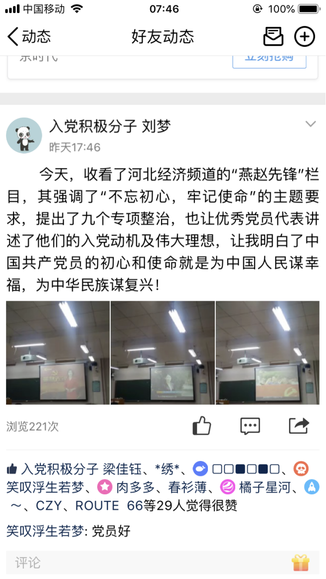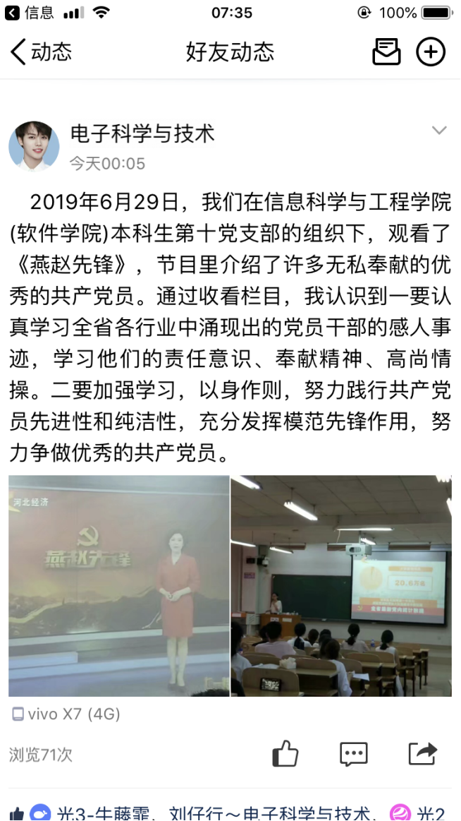 本次特别节目,充分展示了先进基层党组织和优秀共产党员的时代风采,观看完节目后,支部党员纷纷在QQ说说等新媒体上发表观后感,大家表示通过观看本次特别节目,深刻感受到“一名党员就是一面旗帜,一个党组织就是一个坚强的战斗堡垒”不是一句口号,而是共产党员用实际行动证明、用党性演绎、用生命谱写的,同时也接受了一次精神洗礼。通过学习收看,不仅学习了我省先进党员的先锋模范事迹,全体支部党员也要以“燕赵先锋”人物为榜样,不忘初心、牢记使命,学习他们的责任意识、奉献精神、高尚情操。作为大学生党员也要在实际生活学习中做出先锋模范作用,要加强学习,以身作则,努力践行共产党员先进性标准,做合格党员。