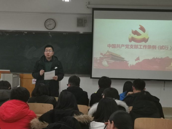 接下来,李老师带领党员学习《条例》,从出台的背景意义出发进行解读。他指出,学习贯彻《条例》,要明确党支部的定位与职责,落实好党支部的基本任务和重点任务,认真开展好党支部组织生活,党支部委员会要定期研究讨论、加强领导指导,切实履行主体责任。并提出以下几点要求:一是严格落实“三会一课”制度,并将其纳入2019年度重点工作,努力发挥党支部战斗堡垒作用。二是对照《条例》,查找支部存在的不足,尽快补足短板。三是将学习《条例》作为今后的一项长期政治任务,要将《条例》内容学通弄懂。四是要严格落实组织生活制度。五是要要推动学院党建工作和日常学生工作融合,在日常学习工作中,党员要发挥模范带头作用。六是要创新支部工作,注重凝练和树立支部品牌,使支部工作在师生中有着较高的享誉度。七是要做好发展党员工作,要讲优秀学生纳入党支部,为支部增添新鲜血液。