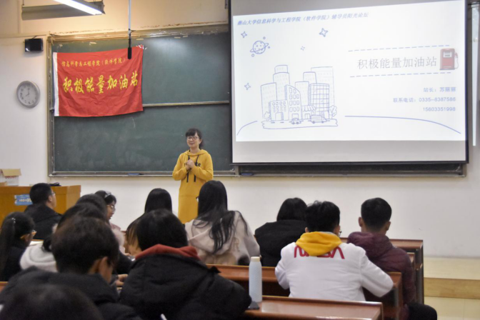 11月26日晚信息科学与工程学院(软件学院)积极能量加油站在里仁教学楼J205组织全院各班级心理委员开展积极心理学相关培训。本次会议由信息科学与工程学院(软件学院)辅导员苏丽丽老师主讲。