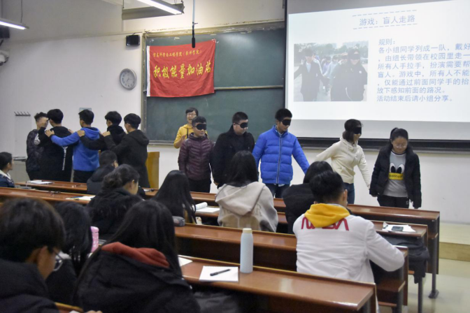 培训期间,老师通过各种知识的讲解、与同学的交流互动并让同学们亲身参与“盲人走路”的小游戏,不仅充分调动了同学的积极性,更让同学们有更深切的感受。培训最后,苏老师告诉与会心理委员,要学会从生活的细节上调整自己的心态,保持自己及身边人的积极能量。