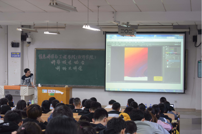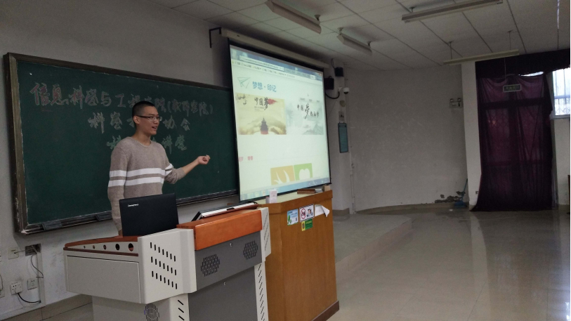 王崇志、李丹阳同学以多媒体设计大赛作品:《青年梦,中国梦》、《梦想·印记》为例,讲解了多媒体设计大赛的相关流程,并详细介绍了Photoshop等平面软件的使用技巧,他们的讲解由易到难,深入浅出,渐学渐进,十分生动形象,收到了与会学生的一致好评。