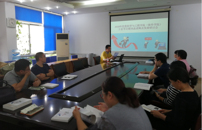 2018年9月12日下午15:00,信息科学与工程学院(软件学院)工会在信息馆302召开了节日慰问品采购及发放研讨会,由院工会主席李浩然老师主持,学院工会委员、各系工会组长以及部分教师代表参加了会议。