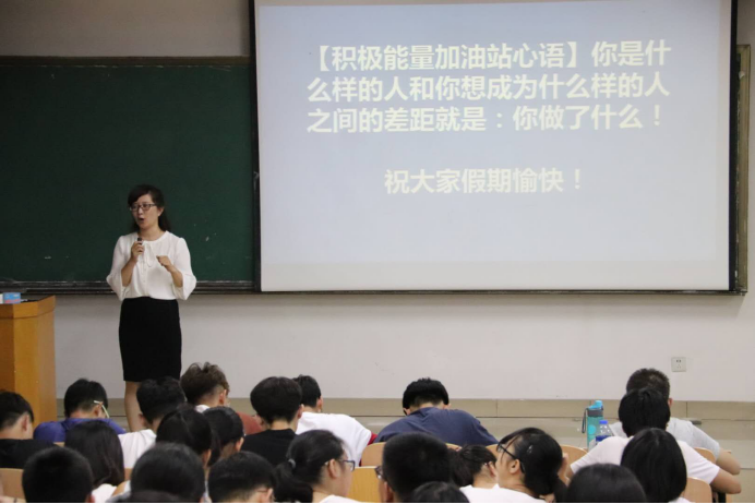 最后,苏老师让同学们回答了三个问题:大一学年最遗憾的事、最骄傲的事、最想做的事。并以积极能量加油站心语:“你是什么样的人和你想成为什么样的人之间的差距就是你做了什么!”作为结束,希望大家利用假期完善自己。