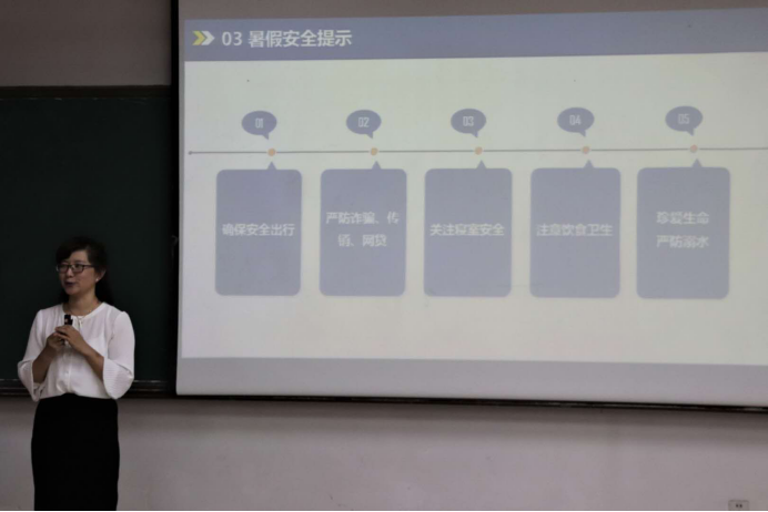 会议由辅导员苏丽丽主持,从暑期放假时间、诚信考试、暑期安全提示、办理生源地贷款、优秀学生案例、暑期该做的事、本学期回顾7个方面展开。重点强调诚信考试和安全教育,将《燕山大学学生违纪处分(处理)实施细则》中有关考试违纪、作弊处分相关条例通过案例讲解;从确保安全出行,严防诈骗、传销、网贷、邪教、暴恐,关注寝室安全,注意饮食卫生,珍爱生命、严防溺水、酗酒5个方面进行全方位的教育。