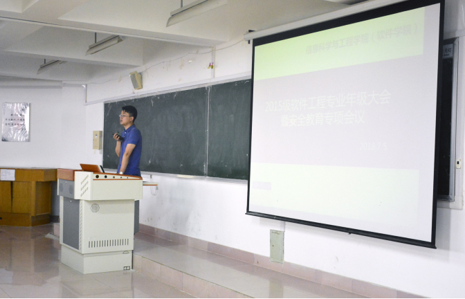 临近假期,为保障学生假期在校、在外安全,保证实训等教学环节顺利进行,同时促进学生对2018学年春季学期的学业、生活进行总结,更好的规划未来发展,7月5日上午,信息科学与工程学院(软件学院)2015级软件工程专业在东校区第三教学楼213教室召开年级大会暨安全教育专项会议。
