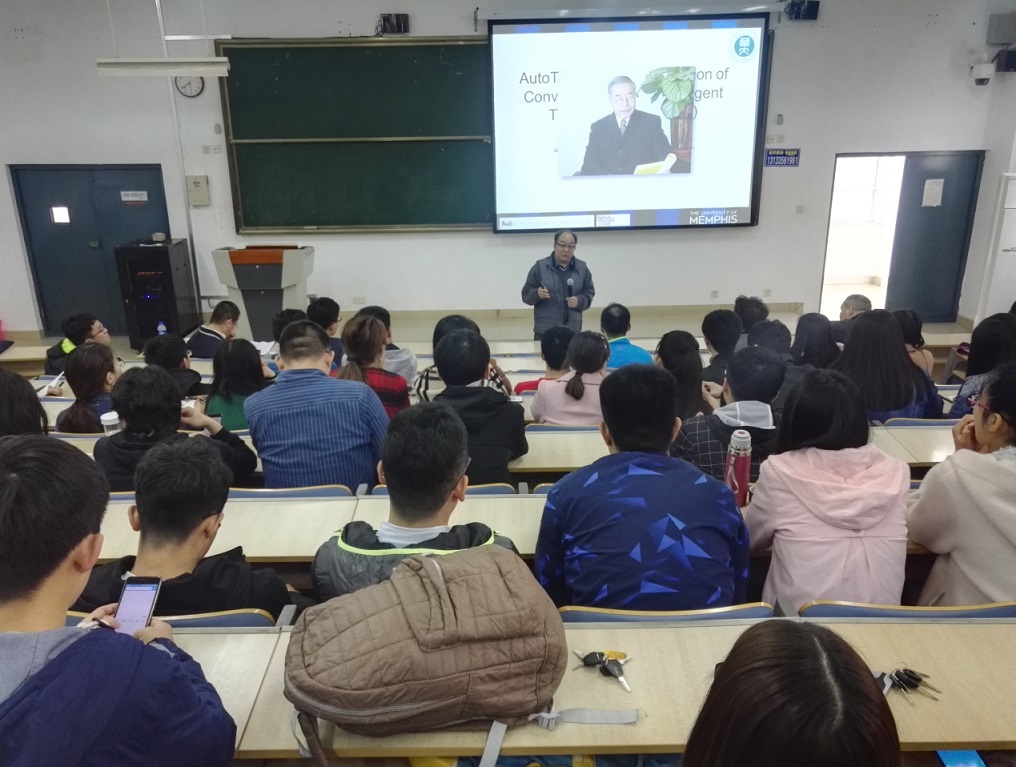 报告会上,胡祥恩教授首先介绍了自己所带团队的当前研究工作和相关学术背景,然后介绍了美国孟菲斯大学旗舰智能软件AutoTutor的发展历史和应用研究,接着详细讲解了以AutoTutor所采集的实时会话数据进行高效数据分析以提升软件智能化的完整方案,最后细心回答了现场师生提出的问题并与大家进行了深度交流。据胡教授介绍,AutoTutor以学习认知理论作为理论基础,基于会话实现智能化工作机制,相关技术涉及认知心理学、计算行为学、人工智能、数据挖掘和知识表示等多个学科的交叉融合,解决生活中看似细小的实际应用问题,背后却蕴含着大量研究工作的持续支撑。