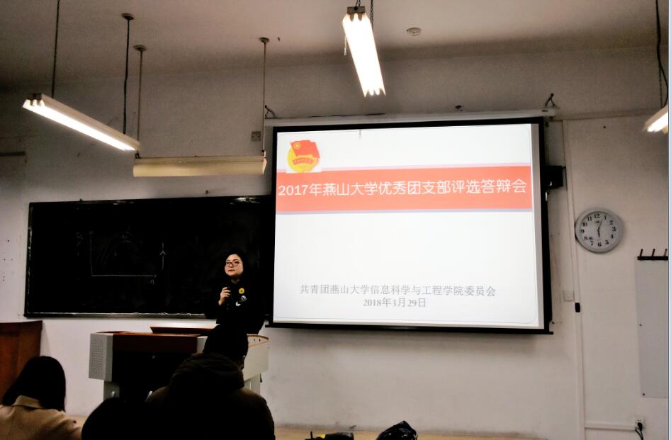 大会开始,方立华老师致开幕词并介绍评审规则。随后,各团支部代表通过PPT展示了在过去的一年里,各项主题团日、主题教育以及志愿服务等活动的开展情况;同时对本支部在思想引领、组织工作、学风建设、团日活动、活力建设等方面进行总结。经过激烈的角逐,硕研16-23班、硕研16-24班、软件工程15-5班、通信工程15-3班、计算机科学与技术15-1班、计算机科学与技术15-4班团支部、计算机科学与技术16-3班、电子科学与技术16-1班、电子科学与技术16-4班、软件工程16-3班、电子信息工程16-1班、计算机科学与技术17-3班、计算机科学与技术17-4班、软件工程17-4班,共14个团支部被评为2017年度燕山大学优秀团支部。