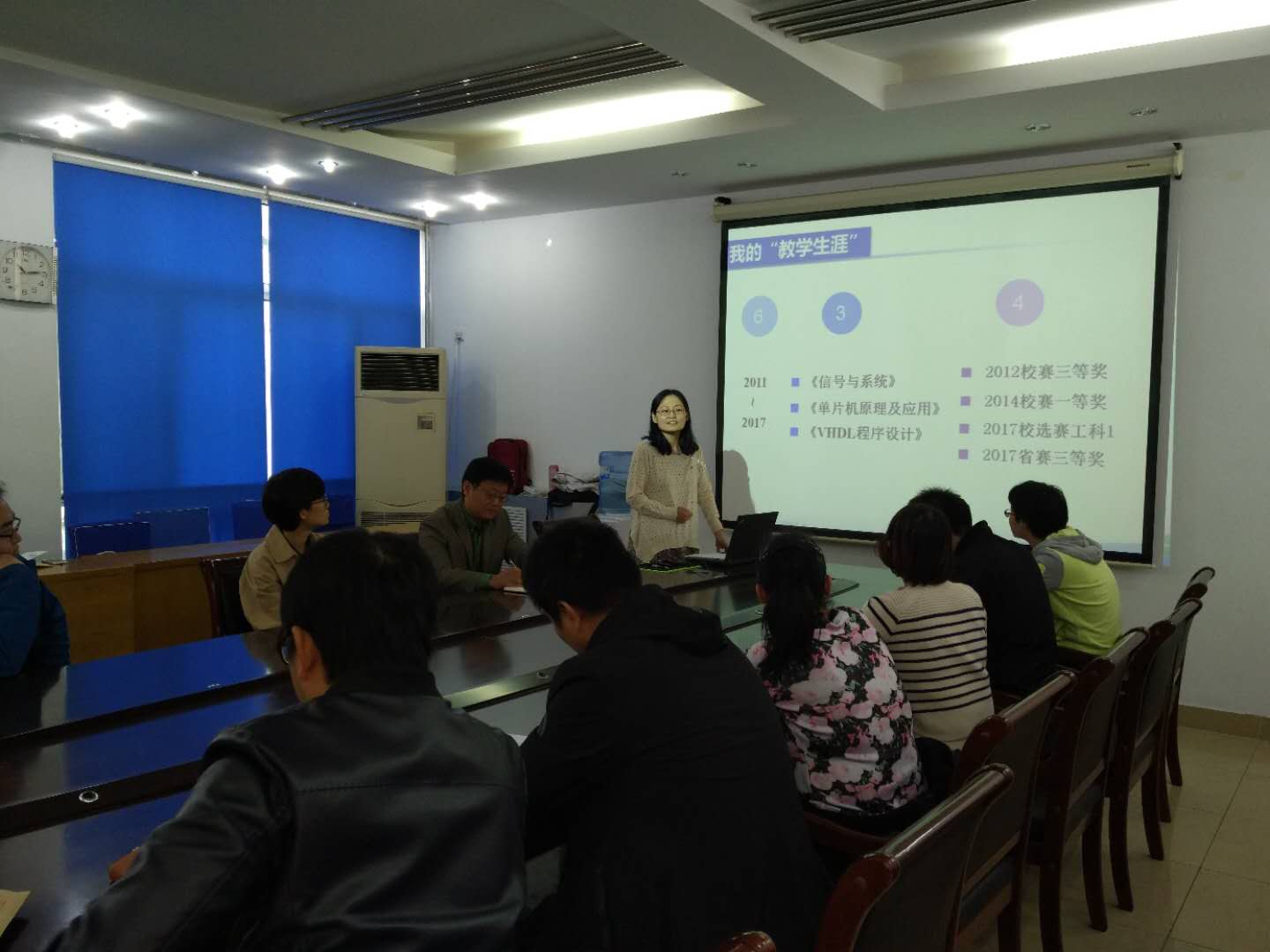 随后,闫盛楠老师结合刚刚参加过的河北省高校青年教师教学竞赛,从赛前准备、课堂教学、教学反思三个部分,对竞赛过程进行了详尽的解读。同时,结合比赛各部分的具体要求、赛前教学材料的准备以及实际参赛过程中对各类情况的处理,与自己的实际教学工作感悟相结合,和大家进行了交流和分享。