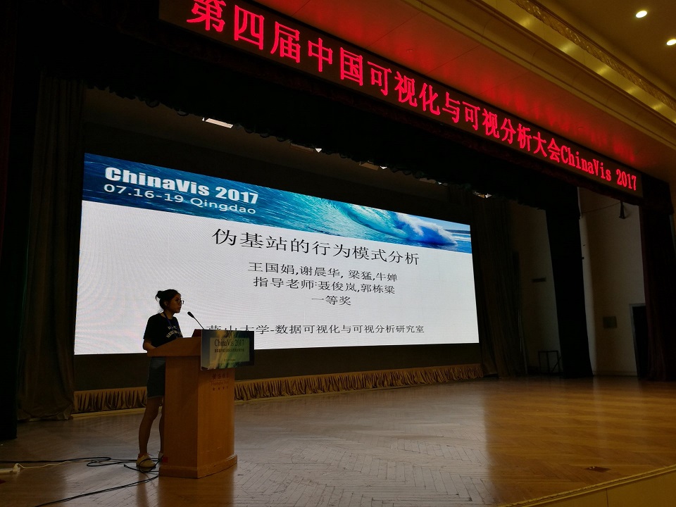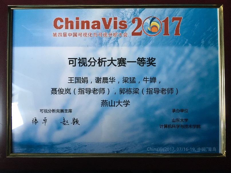 2017年7月16-19日,第四届中国可视化与可视分析大会(ChinaVis2017)在山东青岛举行。在本届会议的数据可视分析挑战赛环节,我院教师聂俊岚、郭栋梁指导的王国娟、谢晨华研究生团队从全国68支参赛队中脱颖而出,与天津大学、东北大学并列获得挑战赛一等奖。这也是继ChinaVis 2016我校第二次蝉联该项赛事最高荣誉。