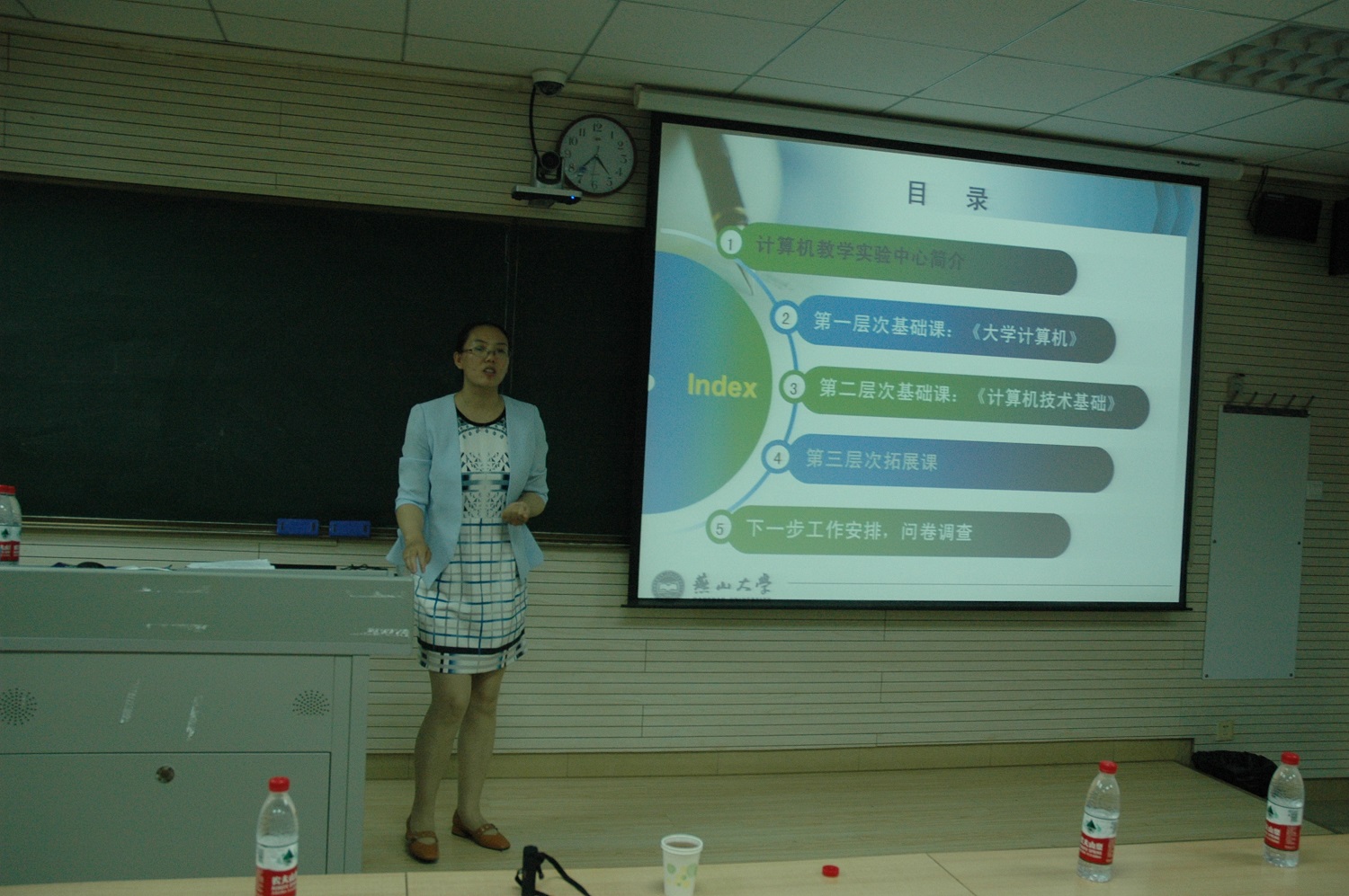 首先,计算机教学实验中心党支部书记巢进波老师对我校《大学计算机——计算思维导论》和《计算机技术基础》课程近三年的教学改革情况做了汇报。重点从三个层次介绍了我校2017年秋季学期即将执行的计算机公共基础课课程体系。为各专业在构建新版培养计划中对学生计算思维能力的培养提供支持和建议。