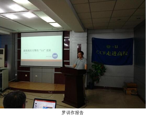 报告开始前,唐勇发表了热情洋溢的感谢致辞,并向到场师生介绍了罗训教授。随后罗训以幽默诙谐的方式开始,介绍了自己求学、工作经历。之后,罗训简要介绍了虚拟现实技术的发展史,结合自身所研究的CAVE系统,向师生描述了虚拟现实引擎的三个演进过程,科普了引擎软件与底层硬件之间的逻辑关系。同时罗训从自己所参与高通工作说起,分析了计算机图形学与现实的结合点,引发了学生的思考。演讲之后,罗训回答了在场师生所提出的问题,对创新创业提出了自己的看法。