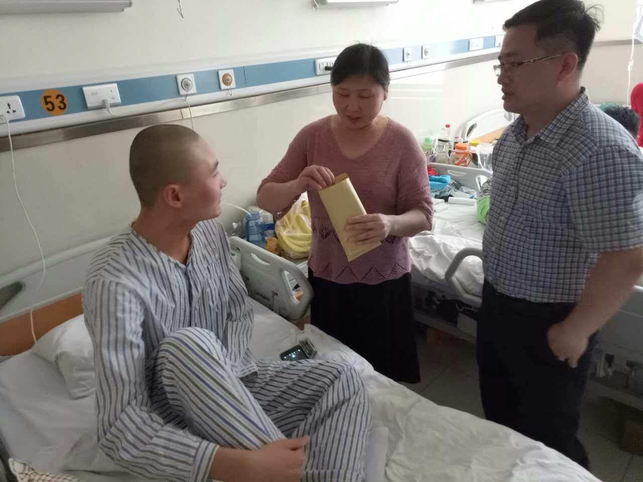 几位老师代表学院亲切慰问武非凡同学,把学院师生的爱心善款交到了学生家长手中,鼓励学生要有战胜疾病的信心和决心,安心治病,争取早日康复, 并安慰家长,一定要保重身体。武非凡家人非常感谢学校、学院对他们全家给予的关心和捐助。