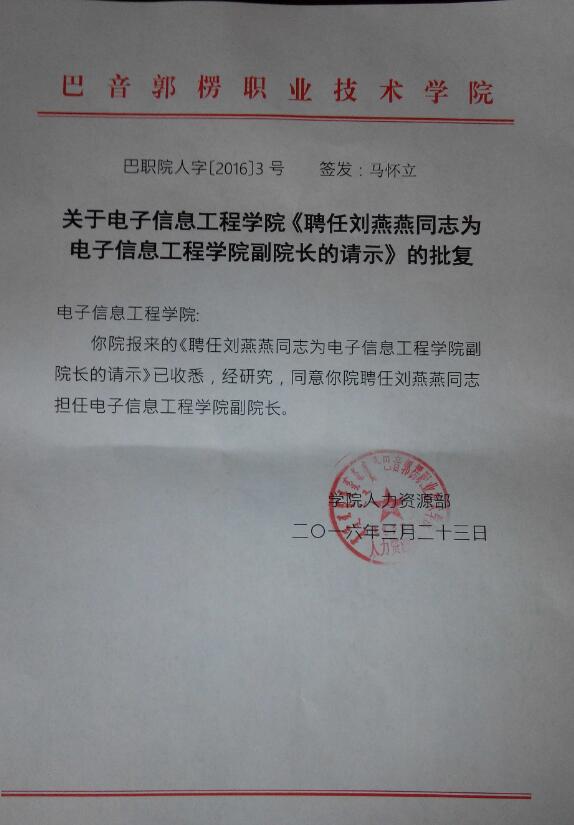 为响应省委、省政府落实党中央、国务院对口援疆工作,2015年8月我院选派政治素质过硬,责任心强的刘燕燕老师援疆支教。由于近9个月的工作表现,能力突出,获得了援疆单位巴音郭楞职业技术学院认可,于2016年3月被聘任电子信息工程学院副院长。