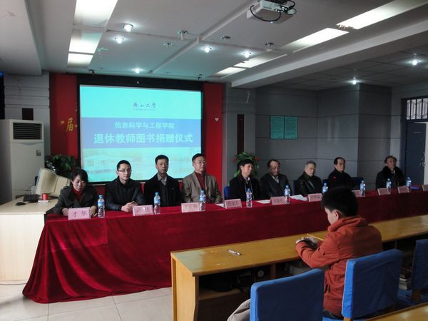 2013年4月17日下午14:30,信息科学与工程学院在信息馆401举行退休教师图书捐赠仪式。出席本次仪式的领导有燕山大学离退休工作处处长、党委书记刘新民,燕山大学离退休工作处党委副书记常顺利,信息学院党委书记卢辉斌,信息学院院长任家东,信息学院党委副书记、副院长产佳。同时信息学院的退休教师孟庆有老师、杜文升老师、谭云福老师作为捐赠代表参与了此次仪式。