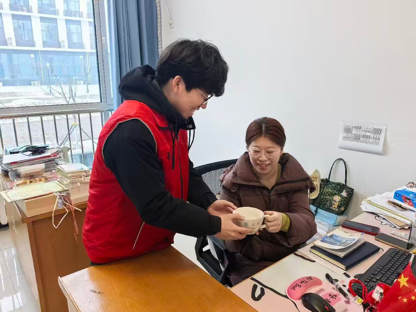图2 一杯热水暖师心,志愿温情润校园