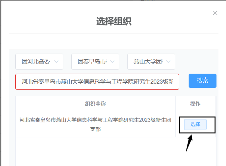 请依次选择“团河北省委”、“团秦皇岛市委”、“燕山大学团委”,并在搜索框中搜索“河北省秦皇岛市燕山大学信息科学与工程学院研究生2023级新生团支部”。之后选择与下图中名字相对应的团支部。