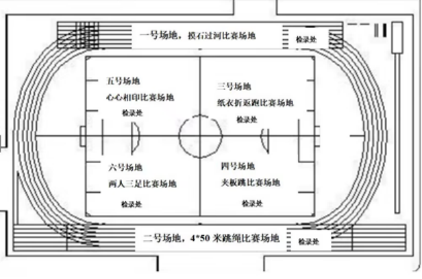 规则:选手1号从百米起点出发,选手2号、4号在50米处等待选手3号在100米终点处等待。1号需一边双脚跳绳,一边向前。然后把跳绳传递给2号,2号以相同方式到达100米终点传递给3号,3号以相同方式返回,到达50米点处传递给4号,4号最终回到100米起点处。结束计时。用时短者获胜。