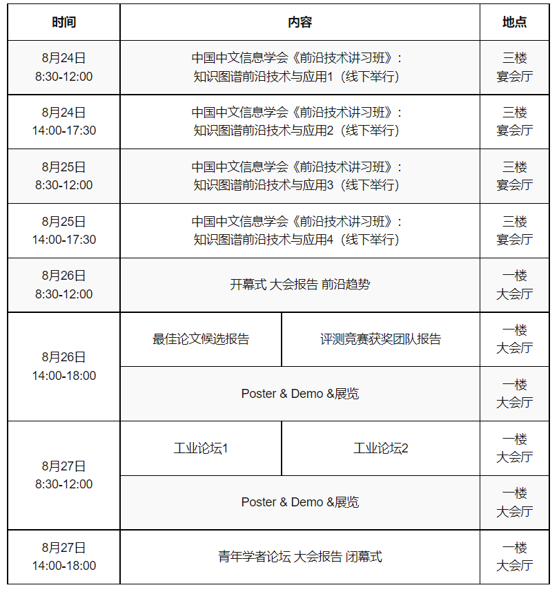 会议将包括学术讲习班、大会特邀报告、工业界论坛、评测与竞赛、知识图谱顶会回顾、海报与系统展示及学术论文报告等环节。大会将邀请国内外知名学者讲授相关领域的最新进展、发展趋势和实战经验,工业界论坛将邀请产业界的主要研发人员分享经验,促进产学研合作。